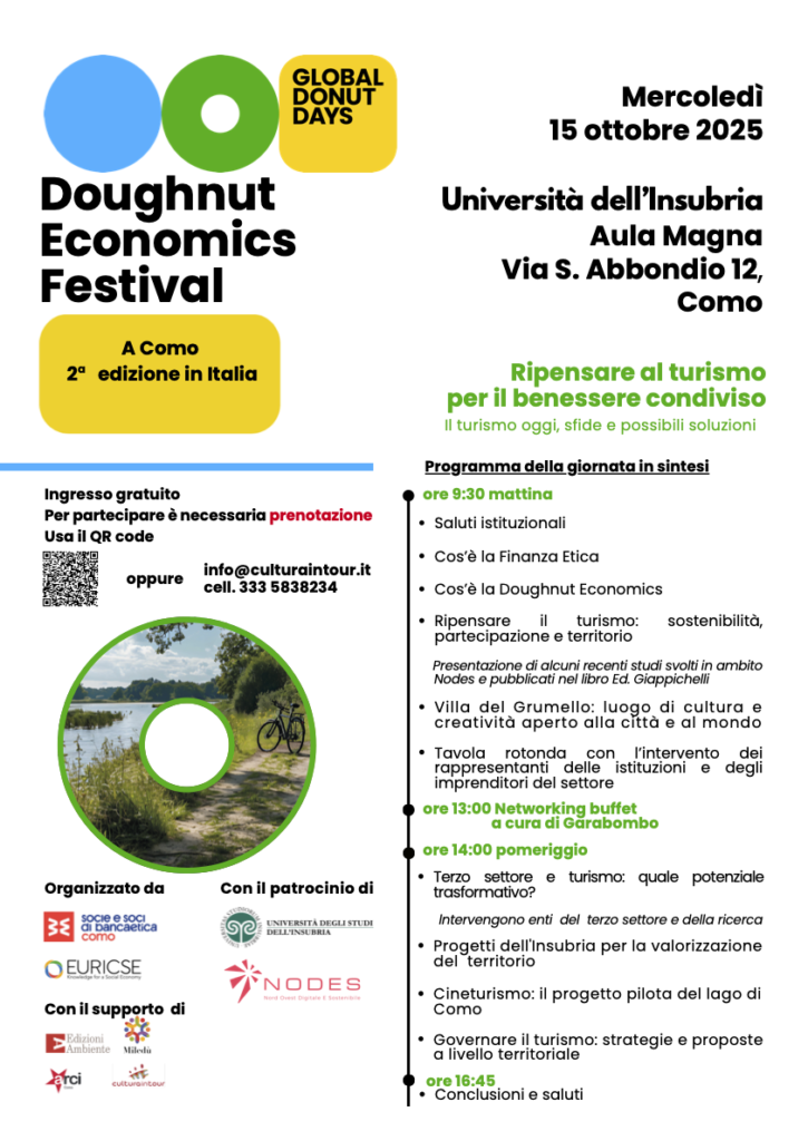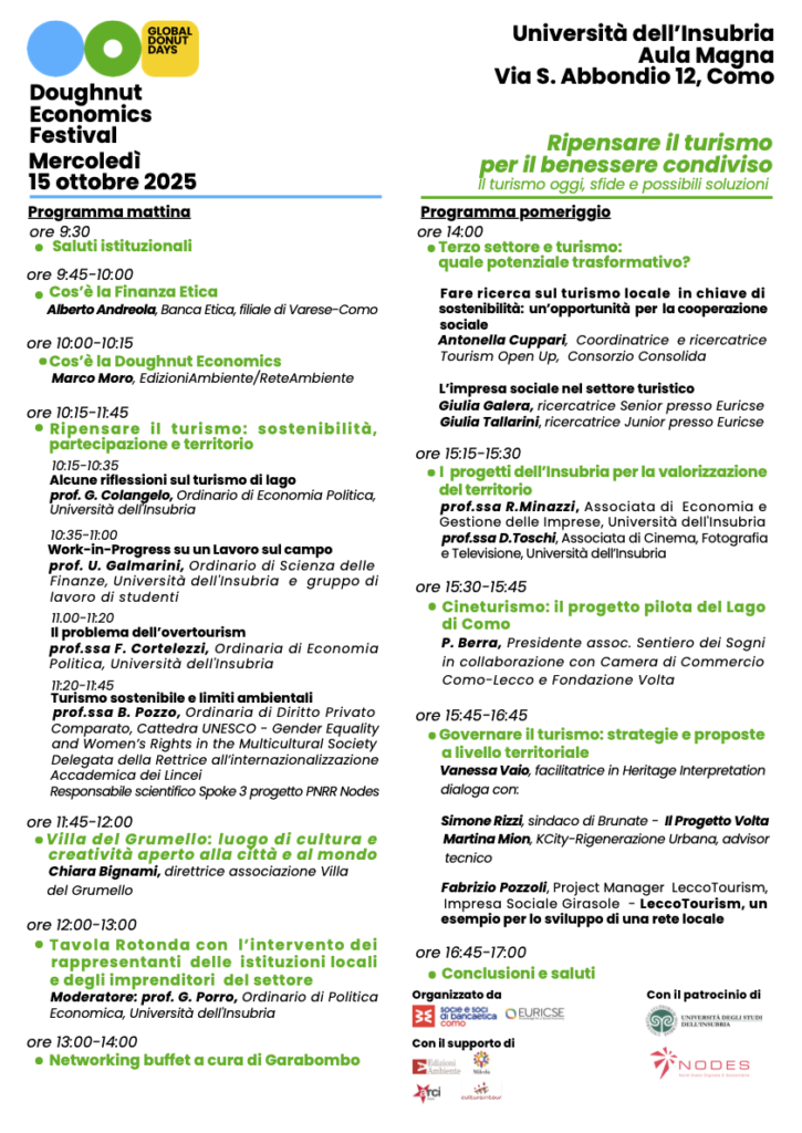 Il titolo del convegno è “Ripensare il turismo per il benessere condiviso” e si svolgerà nell’arco della giornata a partire dalle ore 9:30. L’evento è stato organizzato dal Git, Gruppo Iniziativa Territoriale delle socie e soci di Banca Etica della provincia di Como e da Euricse – European Research Institute on Cooperative and Social Enterprises con il Patrocinio dell’Università dell’Insubria di