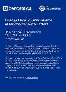 CSV Insubria Varese e Banca Etica organizzano un appuntamento ON LINE dedicato alla cultura della finanza etica e sostenibile, con l’intervento di Enrico Finocchiaro, responsabile della filiale di Varese di Banca Etica.