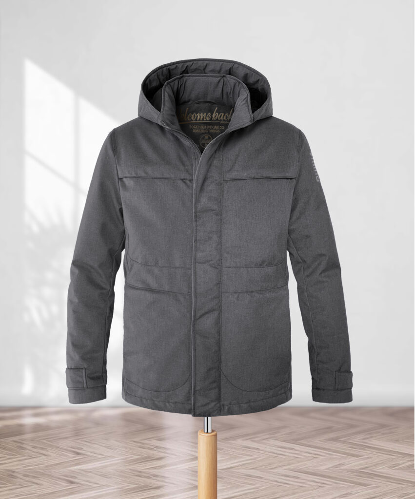 Quattro tasche con zip in tono, una tasca con zip interna, con la novità 2025-2026 del cappuccio staccabile con bottoni a pressione invisibili. Impermeabile, traspirante, anti-macchia, antiabrasione. Ricamato a mano.