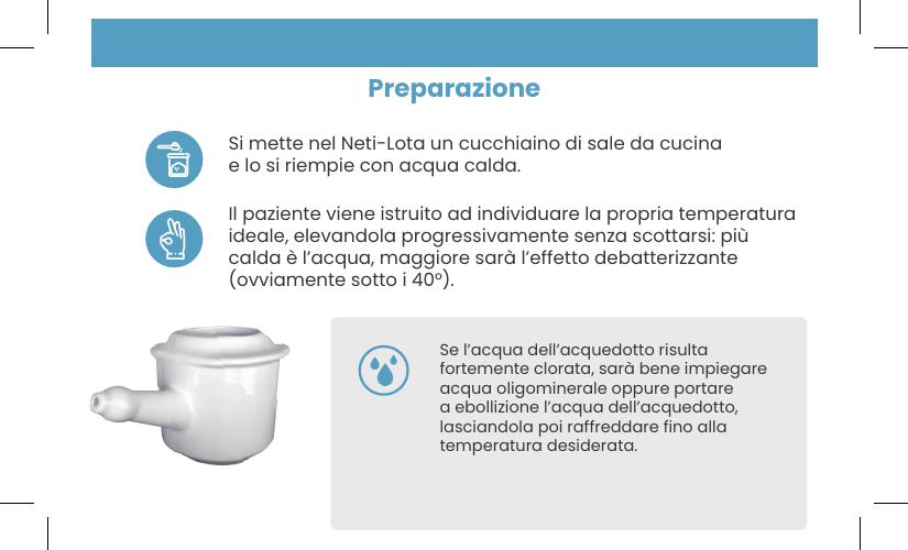 Il Neti lota è lo strumento indispensabile per il lavaggio delle mucose nasali e paranasali, va riempito con acqua moderatamente calda (che non scotti) nella quale va sciolto un cucchiaino di sale fino e si avvia il procedimento sotto descritto. Aiuta a liberare il naso, prevenire raffreddori, sinusiti, riniti, allergie e l’instaurarsi della respirazione orale.